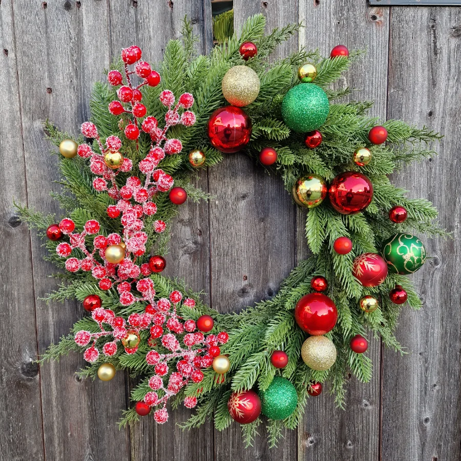 Bring festive cheer to your home with our Frosted Holly & Evergreen Christmas Wreath. This stunning artificial wreath features lush, lifelike pine branches adorned with a delightful mix of shimmering red, gold, and green ornaments. Frosted red berries add a touch of wintry charm, while sparkling baubles catch the light to create a warm, joyful glow. Perfect for doors, walls, or mantels, this wreath captures the timeless elegance of the holiday season and will be a cherished part of your Christmas décor year after year.