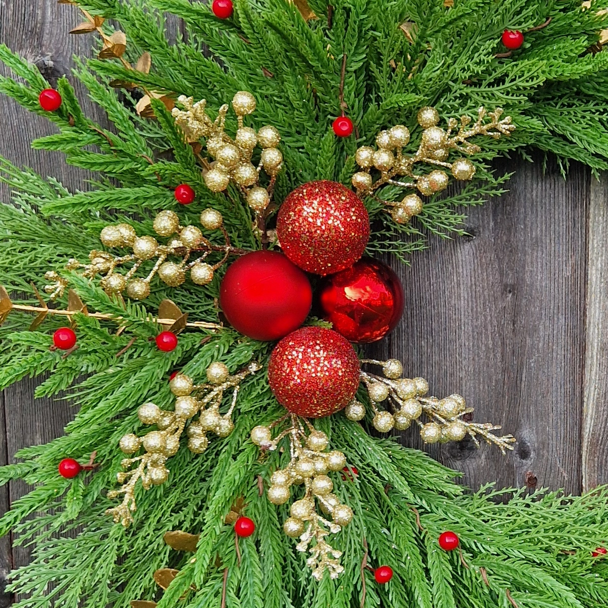 Rich evergreen foliage is arranged on a natural grapevine base, creating a lush, full display with a rustic touch. Clusters of golden berries, shimmering accents, and red baubles add a luxurious pop of colour, perfectly balanced to catch the light and bring warmth to any doorway or wall.
